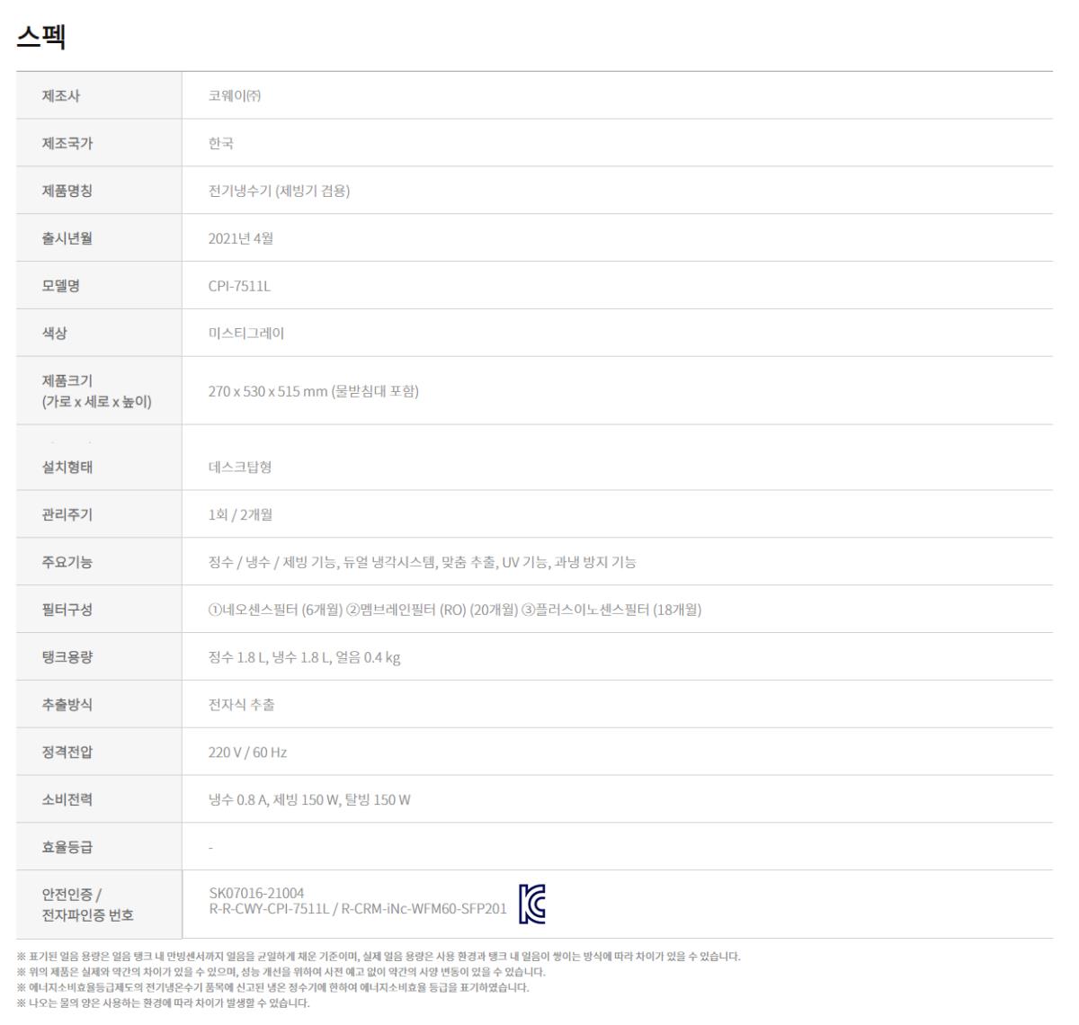 • [코웨이] AIS 정수기 3.0 IoCare 얼음냉정수기 CPI-7511L